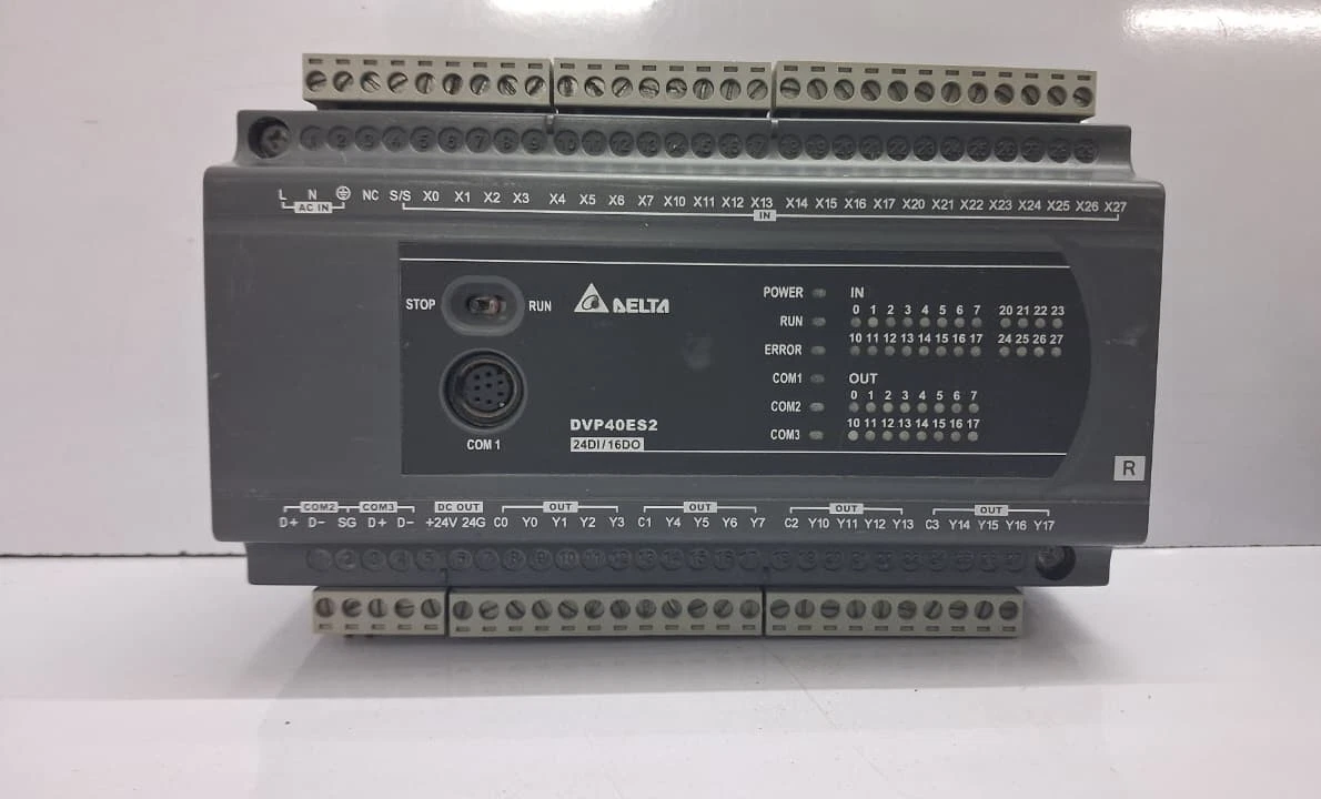 The Delta DVP40ES200R is a high-performance, compact Programmable Logic Controller (PLC) from the DVP-ES2 series, designed for versatile industrial automation and process control. This unit features a high-density I/O configuration with 24 digital inputs and 16 relay outputs, providing a total of 40 points in a slim, integrated chassis. Known for its exceptional processing speed and large program capacity, the DVP40ES200R is a preferred choice for applications such as packaging machinery, building automation, and high-speed production lines. As a Used Working unit, it offers a reliable and cost-effective solution for both new installations and the maintenance of existing Delta-based systems.