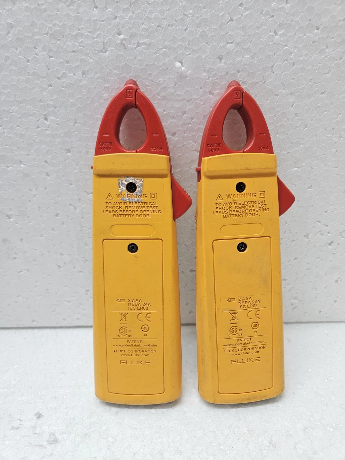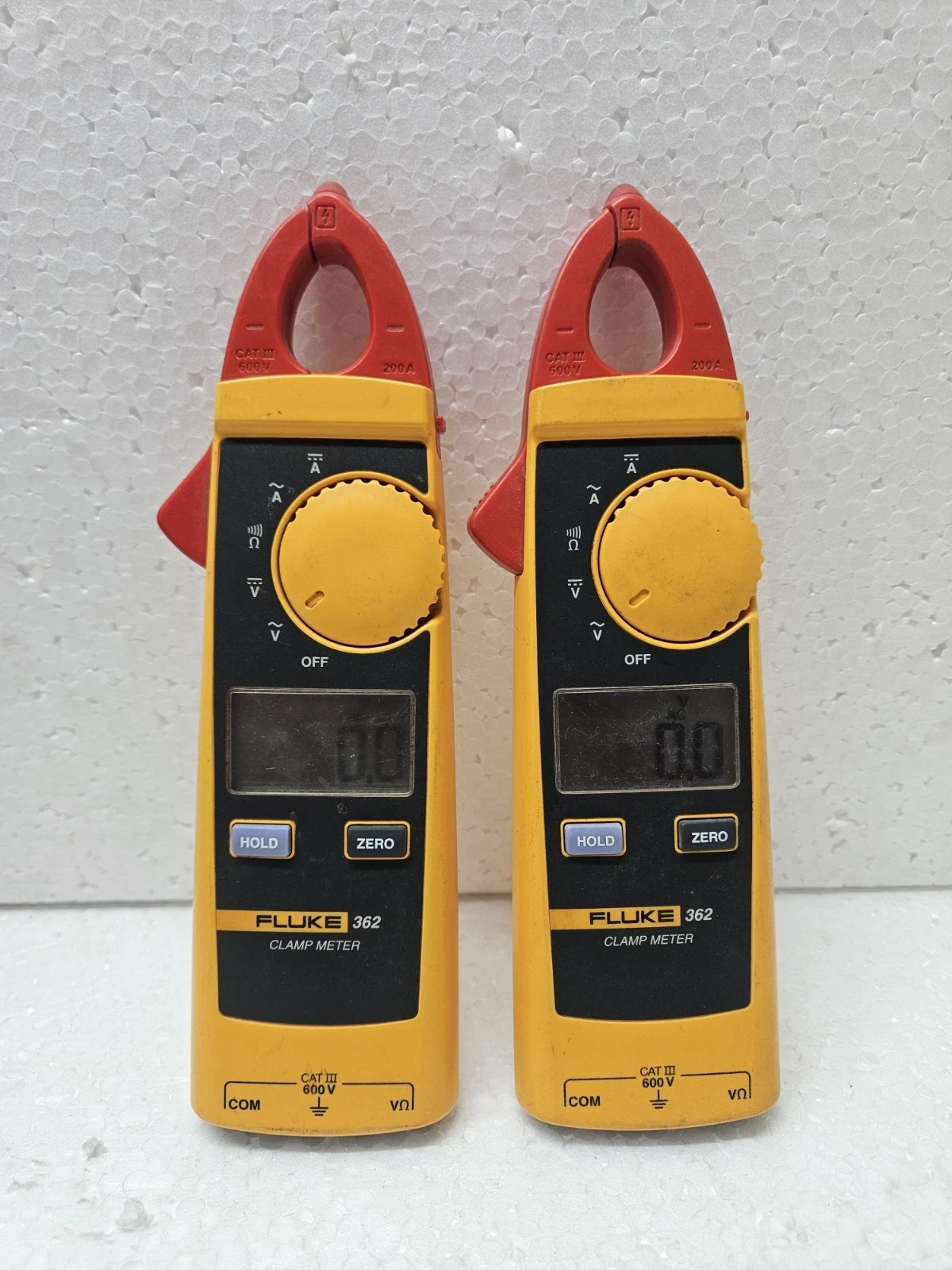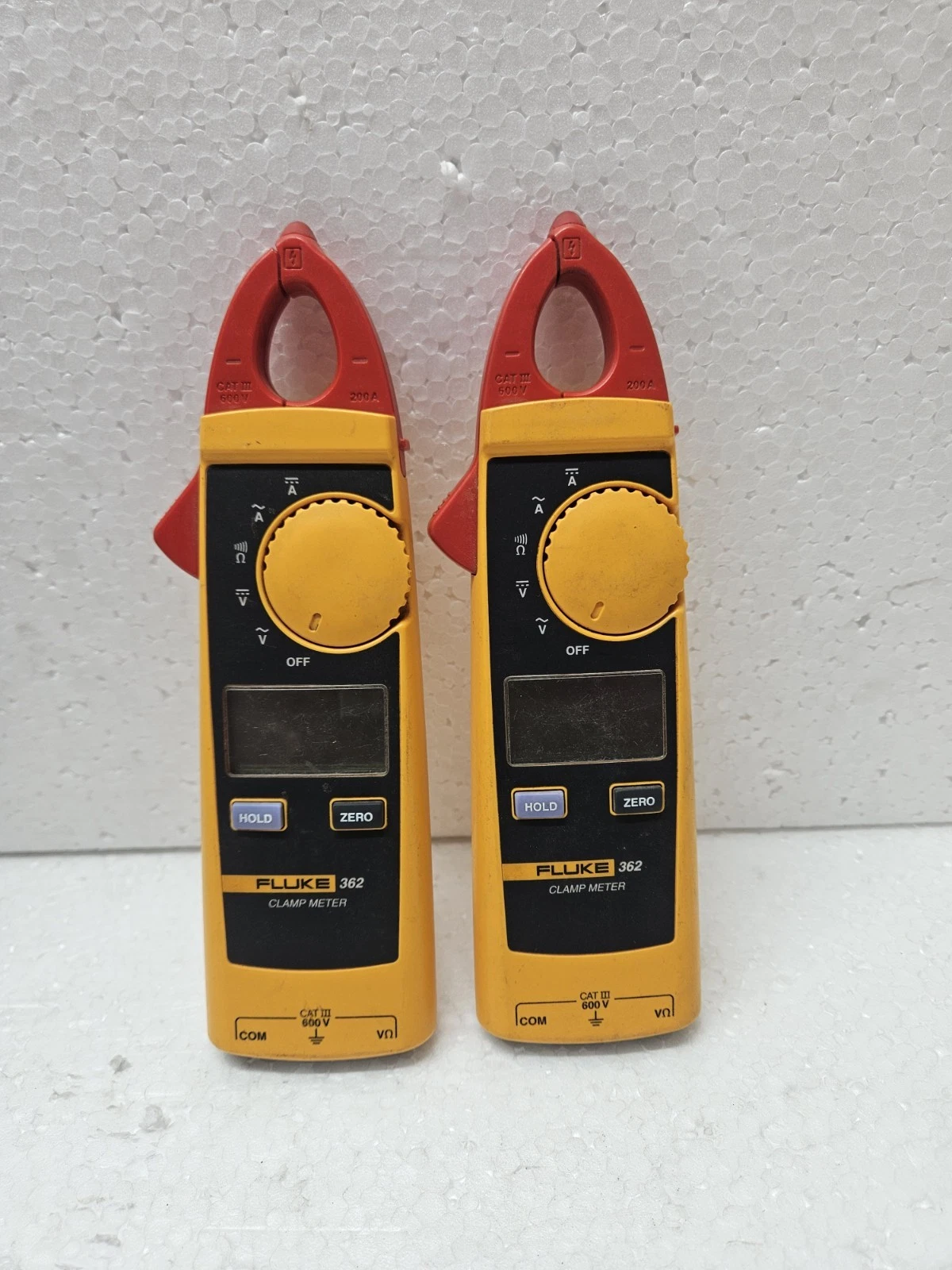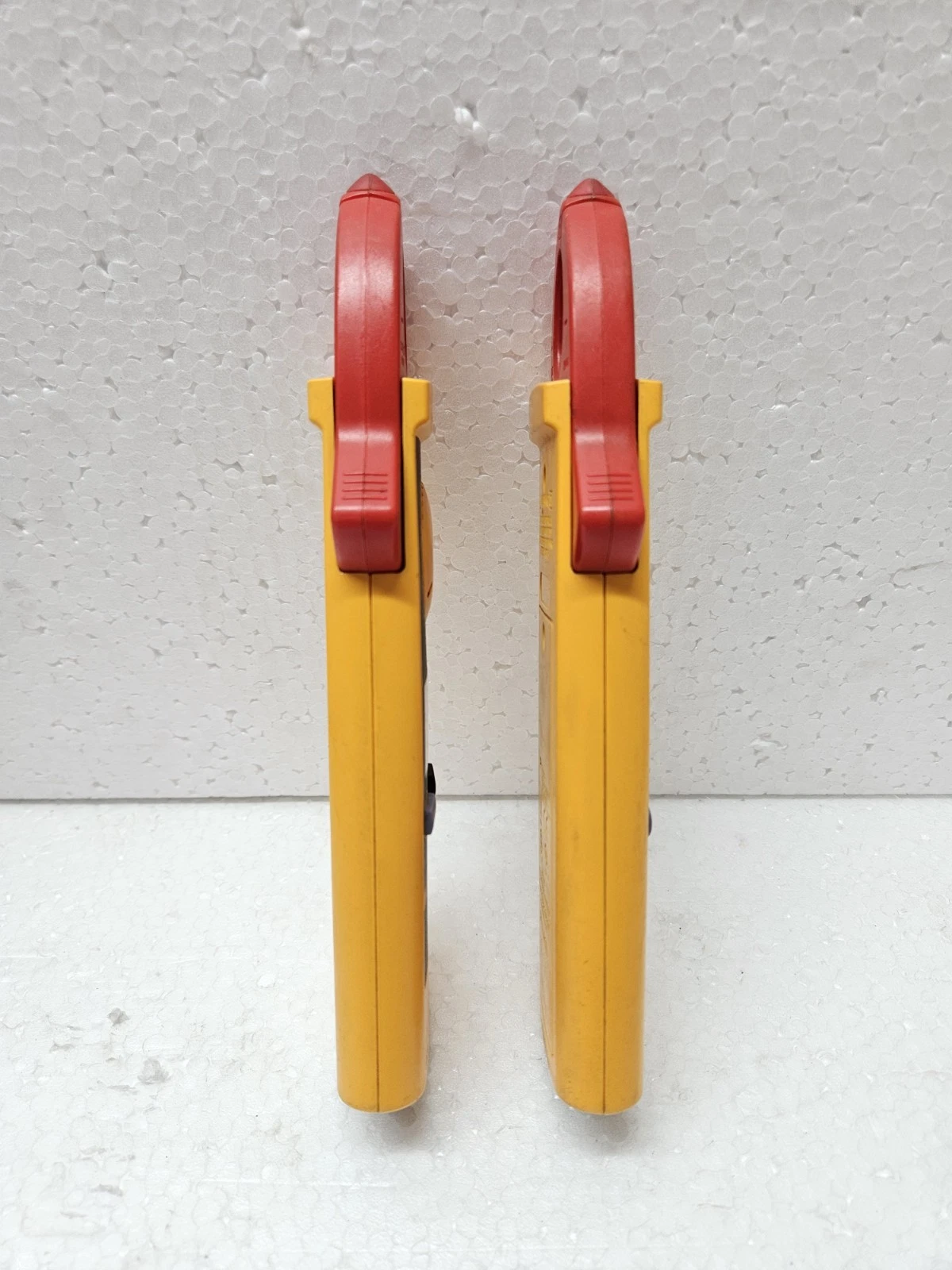 - Functional Status: Used Working. Both meters in this lot have been professionally tested. The clamp jaws close tightly, and all measurement functions (Amps, Volts, Resistance) have been verified against a calibrated source.